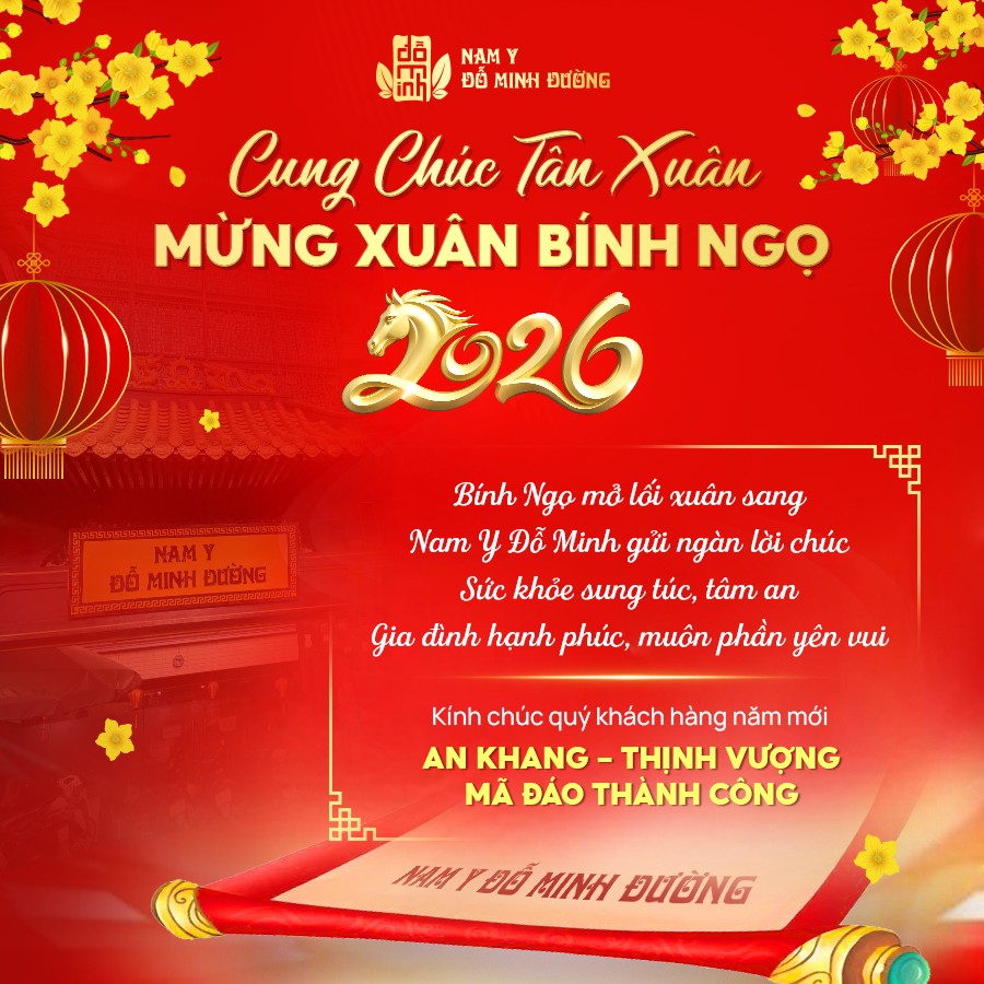 Khi những ngày cuối năm dần khép lại, mùa xuân mới lại về mang theo không khí sum vầy, ấm áp và nhiều hy vọng. Nhân dịp Tết Nguyên Đán Bính Ngọ 2026, tập thể các lương y, bác sĩ và toàn thể cán bộ nhân viên Nam Y Đỗ Minh Đường xin trân trọng gửi tới Quý Khách hàng lời chúc năm mới AN KHANG – THỊNH VƯỢNG – MÃ ĐÁO THÀNH CÔNG.